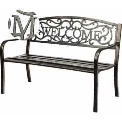 - Notre banc de jardin est parfait pour ajouter le style et la convivialité à votre espace extérieur! Il offre une finition bronze élégante et un design de feuille de lierre qui attire l’attention et qui est agréable à regarder. Le mot « Welcome » gravé dans le dossier donnera une impression de chaleur à votre famille et à vos amis. Des accoudoirs et une assise vous offrent le meilleur confort. Conçu avec un cadre métallique durable et un revêtement fin, ce banc peut résister à tous les temps pour une utilisation de longue durée.