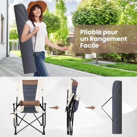 - Ajoutez une touche de confort à votre temps libre en plein air avec notre chaise de camping pliante ! Cette chaise de pelouse offre une grande surface d’assise pour vous détendre, sans parler du dossier multi-couches respirant et du confortable coussin lombaire. De plus, le solide cadre en métal promet une longue durée de vie et une grande robustesse. Conçue avec des patins antidérapants et un porte-gobelet pour répondre à vos différents besoins d’utilisation. La conception pliante pratique et le sac de rangement vous permettent de l’emmener où vous voulez aller. Vous ne regretterez pas d’avoir choisi notre chaise de camping utile !