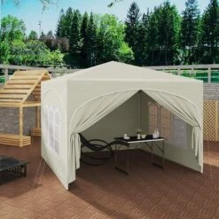- Cette tonnelle est durable et robuste avec une construction en acier massif. Le tissu PE épais est imperméable et résistant au soleil, vous pouvez donc utiliser cette tente lorsque vous sortez pour des activités. La tonnelle peut être facilement détachée, ce qui est pratique pour le transport et le stockage. Des cordes coupe-vent et des piquets de sol garantissent que la tente est suffisamment stable par temps venteux.