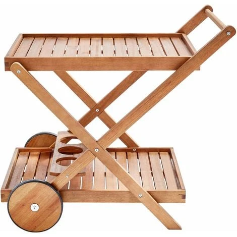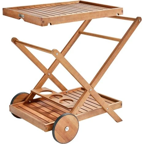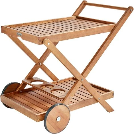 Bien plus qu’un accessoire de décoration, la desserte de jardin à roulette bois de la gamme PORTO vous sera également utile pour les services à table, notamment quand vous recevez du monde. Il peut aussi vous être utile pour organiser la table pendant les repas en famille. D’une largeur de 56 cm, longueur de 82,5 cm et une hauteur 75 cm, elle est pratique et vous permet de servir les plats sur 2 étages. Pour vous mettre un peu plus à l’aise, l’accessoire dispose aussi d’un porte-bouteille. Le tout est fait avec du bois d’eucalyptus certifié FSC. C’est un meuble aussi tendance que durable. Il est huilé pour garantir davantage sa bonne tenue dans le temps. C’est aussi un accessoire que vous pouvez utiliser afin de peaufiner l’aménagement de votre espace extérieur. Sa couleur en teck naturel apportera une touche rustique et élégante à votre aménagement. Outre ses pneus à l’avant et ses pieds en forme de X à l’arrière lui assureront un maximum de stabilité, le porte dessert dispose également d’un repose main qui vous garantira un maximum de confort d’utilisation pendant le service. Apportez un style authentique et naturel avec cette dessertie de jardin.
