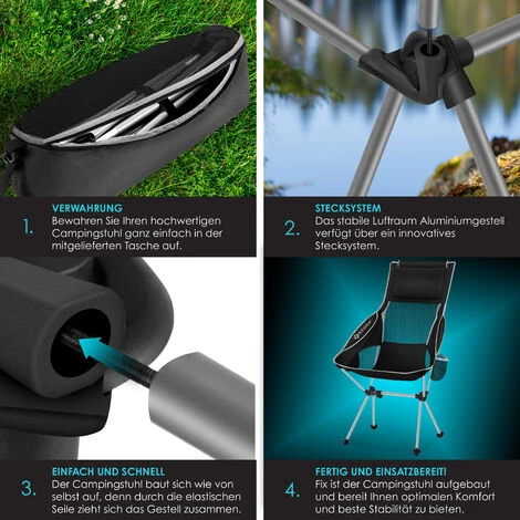 Chaise de camping KESSER en maillage respirant et polyester hydrofuge, châssis robuste en aluminium pour un poids maximum de 120 kg, avec accessoires tels qu’un porte-gobelet intégré, un sac de transport et deux mousquetons.