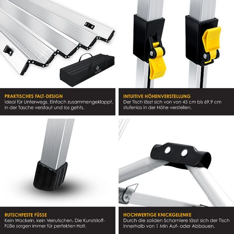 De nombreux détails font de notre table multifonctionnelle un point fort absolu. Grâce au design pliable pratique , vous pouvez plier la table de manière compacte et l’emporter partout avec vous. La table peut être réglée en continu de 45 cm à 69,9 cm en hauteur , ce qui permet également aux petits de s’asseoir confortablement à la table. Il suffit d’utiliser le levier jaune pour fixer ou desserrer la hauteur . Aucun vacillement ou glissement n’est possible, car les pieds en plastique assurent une parfaite stabilité sur tous les types de sols.