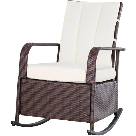 – Fauteuil à bascule en résine tressée imitation rotin : charme cosy du rotin sans ces contraintes d’entretien (polyéthylène pour une plus grande résistance aux UV, à la pluie, au froid, etc…)