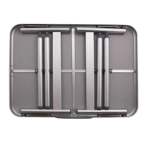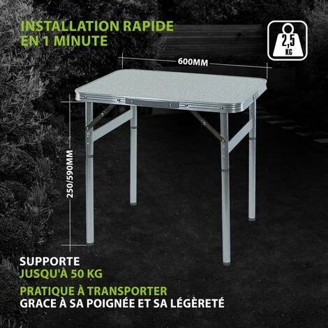 Son cadre en aluminium assure résistance et durabilité, de même que son plateau en bois MDF. Les pieds de la table sont réglables de 25 à 59 mm, ce qui permet d’adapter la table à tous types de terrain en compensant les inégalités, et aussi de l’adapter à votre utilisation.