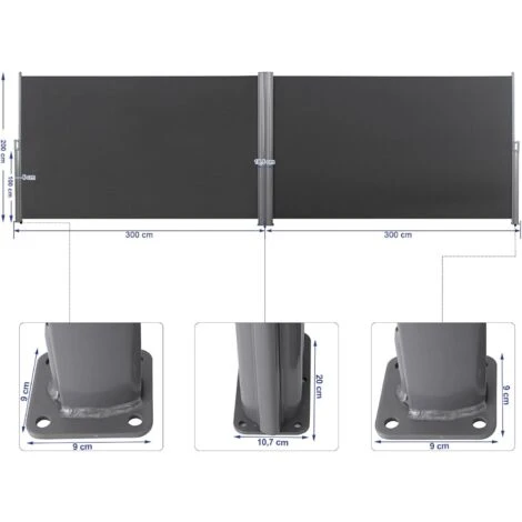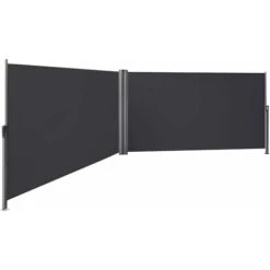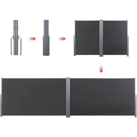 Montez le double store latéral à 180° ou de manière à former un angle. Ainsi vous pouvez aussi utiliser le store sur des angles de votre propriété ou auprès de votre piscine. Offrez-vous un espace privatif! Déployez le paravent des deux côtés, chaque côté mesure 3 mètres, ou, au besoin, n’utilisez qu’un seul côté pour vous faire de l’ombre ou vous protéger du vent. Vous pouvez aussi disposer le double store latéral à l’intérieur; comme, par exemple, dans un bureau, un cabinet médical, un atelier ou un espace commercial.