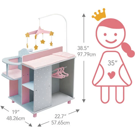 CARACTÉRISTIQUES : Table à langer, étagères de rangement pour poupées, tringle à vêtements, 3 cintres, chaise haute, baignoire bébé amovible, robinets chaud et froid, douchette extensible, mobile scintillant rotatif. Poupée non incluse.
