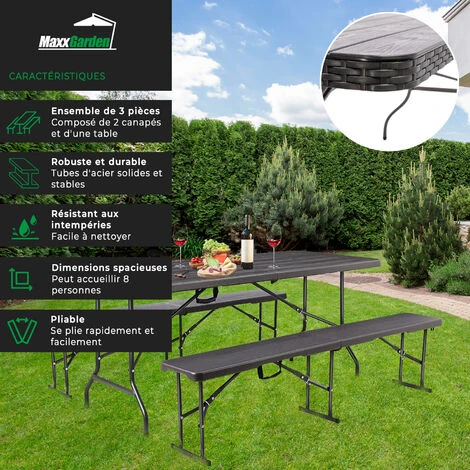 MaxxGarden Table pliante – set de pique-nique pliant – avec 2 bancs – noir