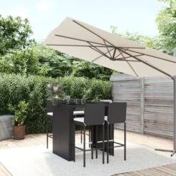 - Matériau : résine tressée, bois d’acacia massif avec finition à l’huile, acier